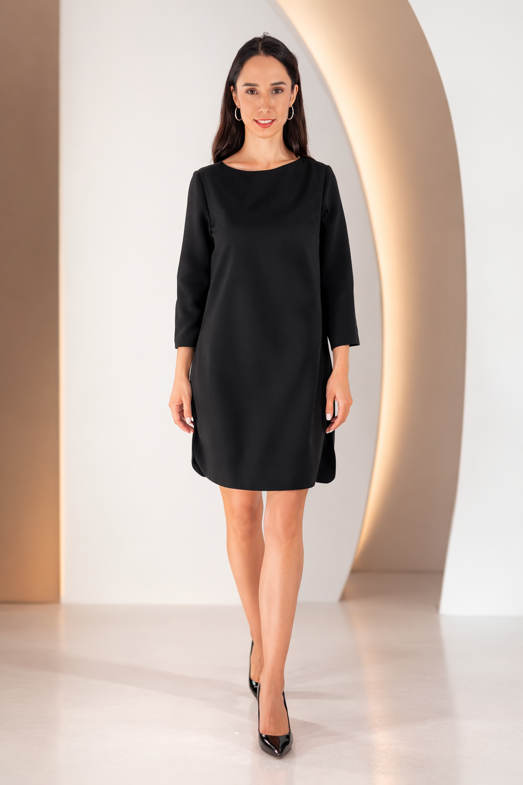 Aceasta rochie eleganta neagra impresioneaza prin designul minimalist si croiala moderna care pune in valoare silueta feminina. Linia simpla si eleganta o transforma intr-o piesa vestimentara versatila, potrivita atat pentru mediul profesional, cat si pentru evenimente elegante.